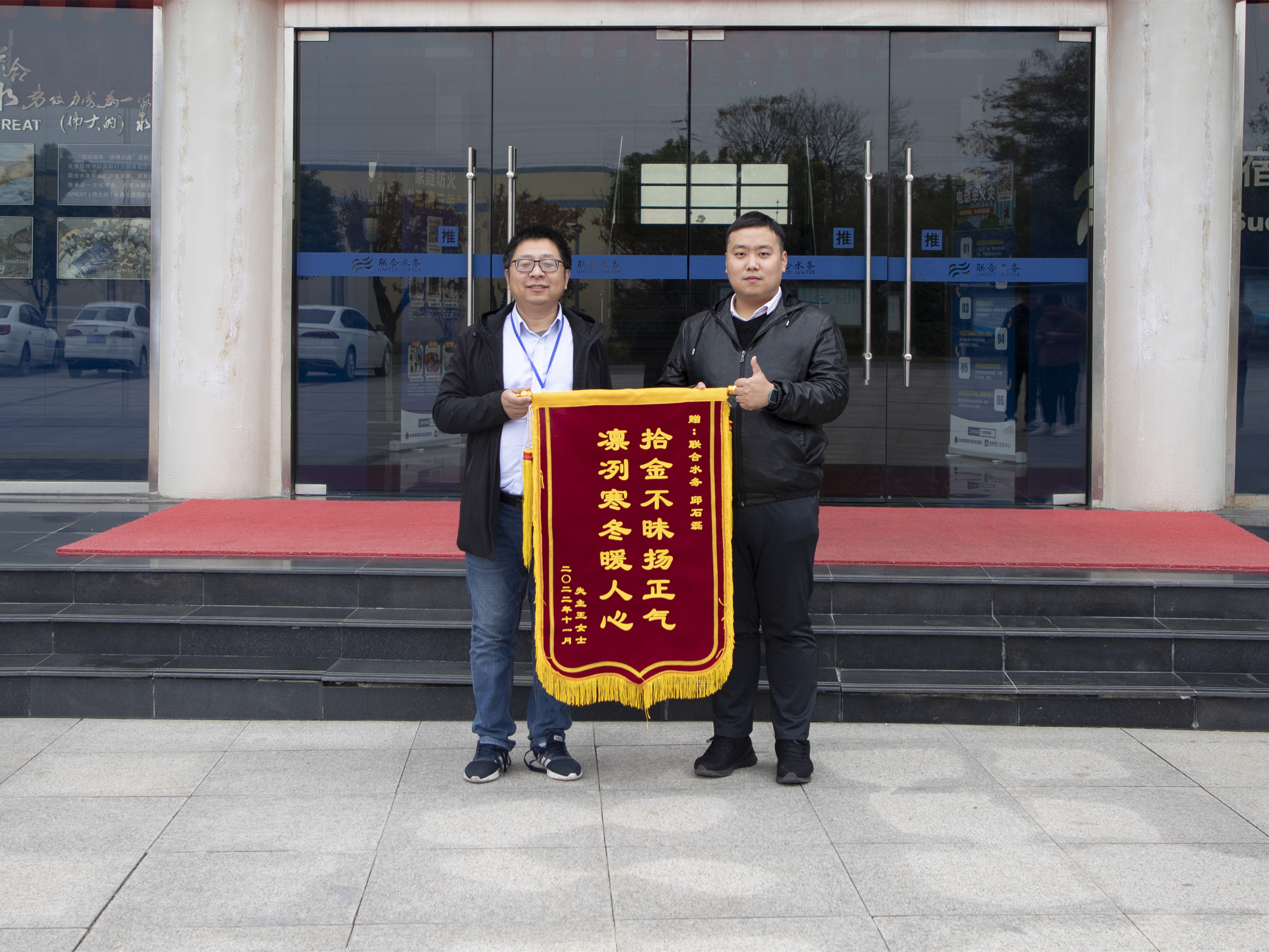 王女士一家回到吾悅廣場,見到邱主任后非常激動,執意要送邱主任一些禮物和酬金表達謝意,邱主任當場拒絕。邱主任反復說這是小事,舉手之勞,而且拾金不昧也是中華民族的傳統美德。王女士通過邱主任之前聯系用的手機號,加上了邱主任微信,通過朋友圈才得知邱主任的工作單位。知道邱主任是一名供水人后,更是對公司大加稱贊,在與丈夫商量后,特意準備了這面錦旗。