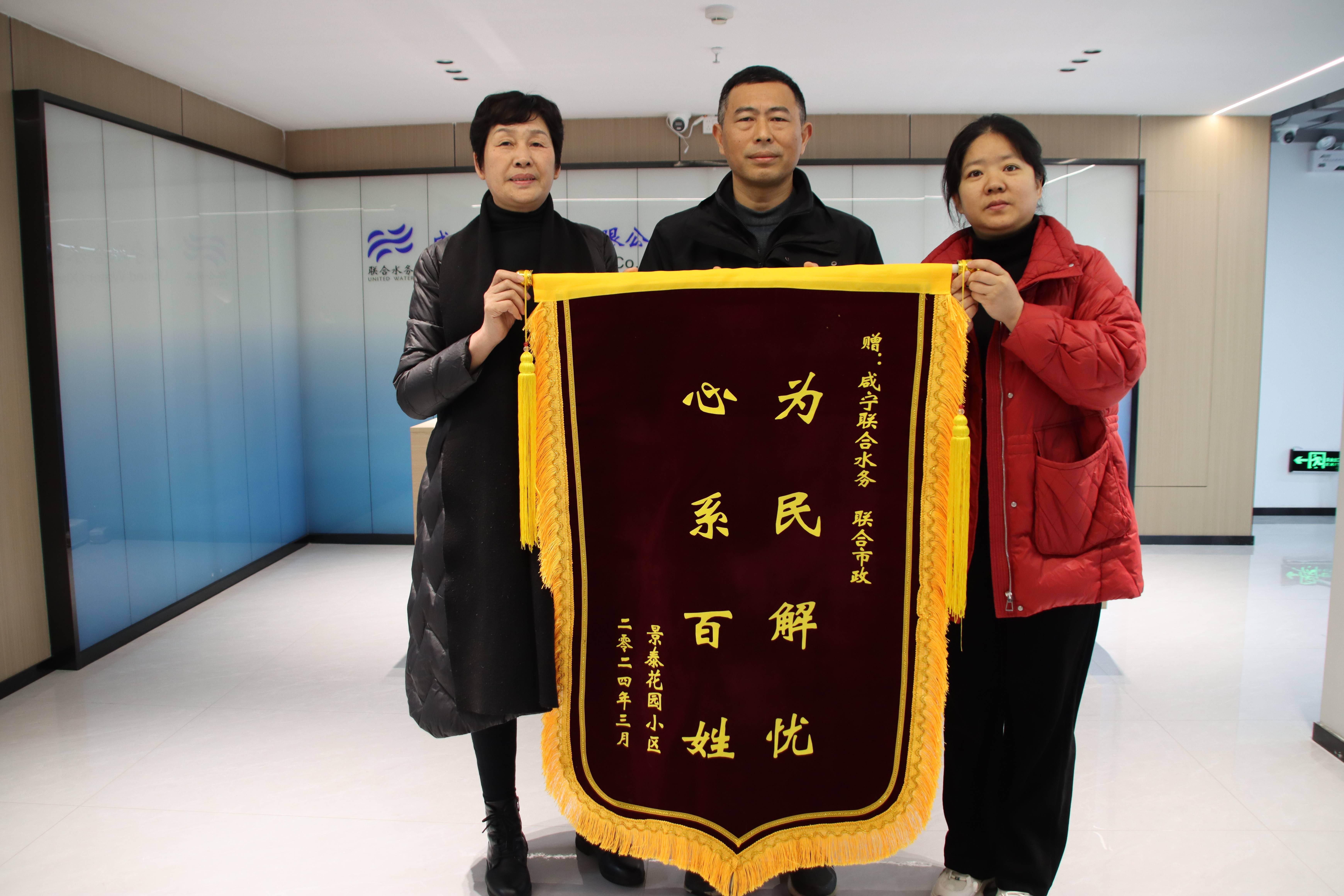 3月18日上午,湖北省咸安區(qū)景泰花園小區(qū)物業(yè)代表楊女士及業(yè)主代表專程將一面印著“為民解憂、心系百姓”的錦旗送到聯(lián)合水務集團運營管理中心管網(wǎng)總監(jiān)兼咸寧區(qū)域管網(wǎng)副總經(jīng)理夏維龍手中,對咸寧聯(lián)合水務有限公司、咸寧聯(lián)合市政工程有限公司積極上門服務、熱情解決居民實際用水問題表示感謝。