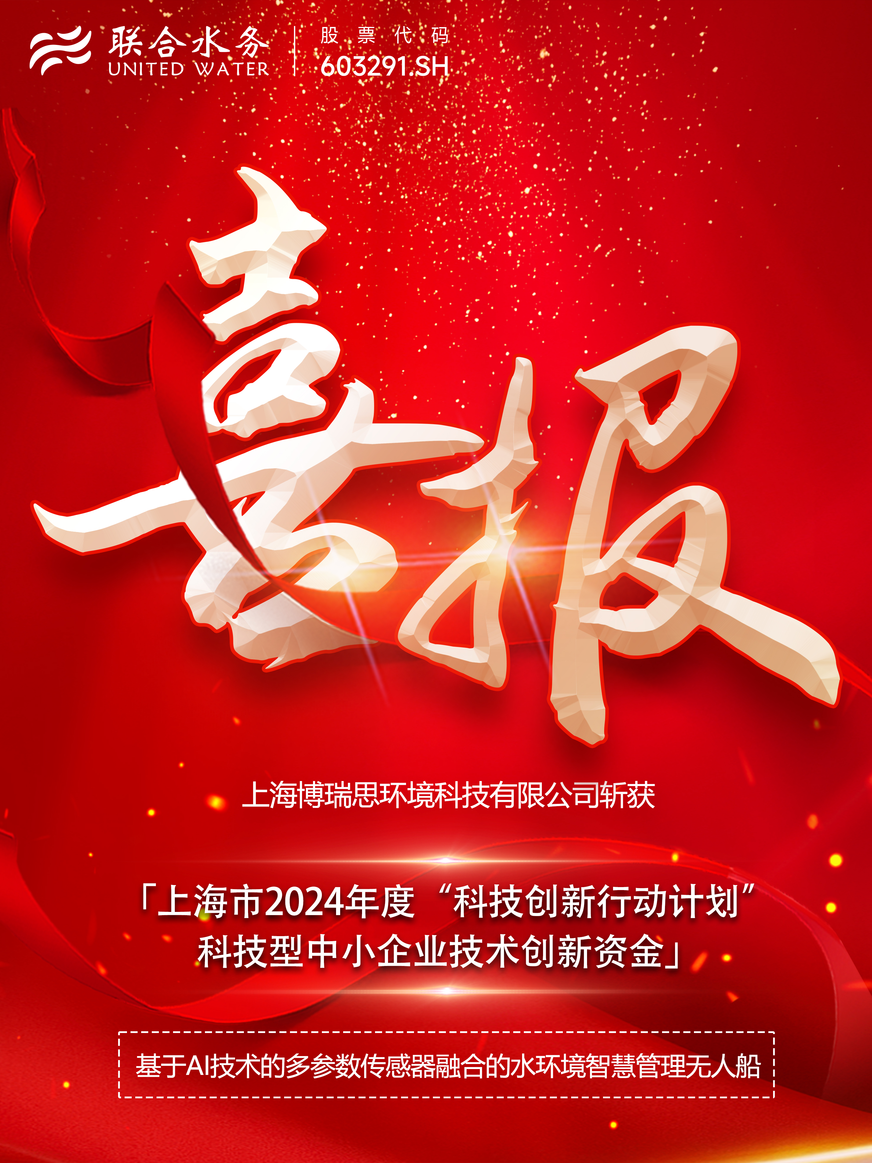 2024年11月29日,上海市科學技術委員會正式公示上海市2024年度“科技創新行動計劃”科技型中小企業技術創新資金擬立項項目清單。聯合水務集團下屬上海博瑞思環境科技有限公司的 “基于AI技術的多參數傳感器融合的水環境智慧管理無人船”項目,在專業賽類別經過第一輪通訊評審、第二輪大賽路演答辯成功入選,獲得創新資金立項。