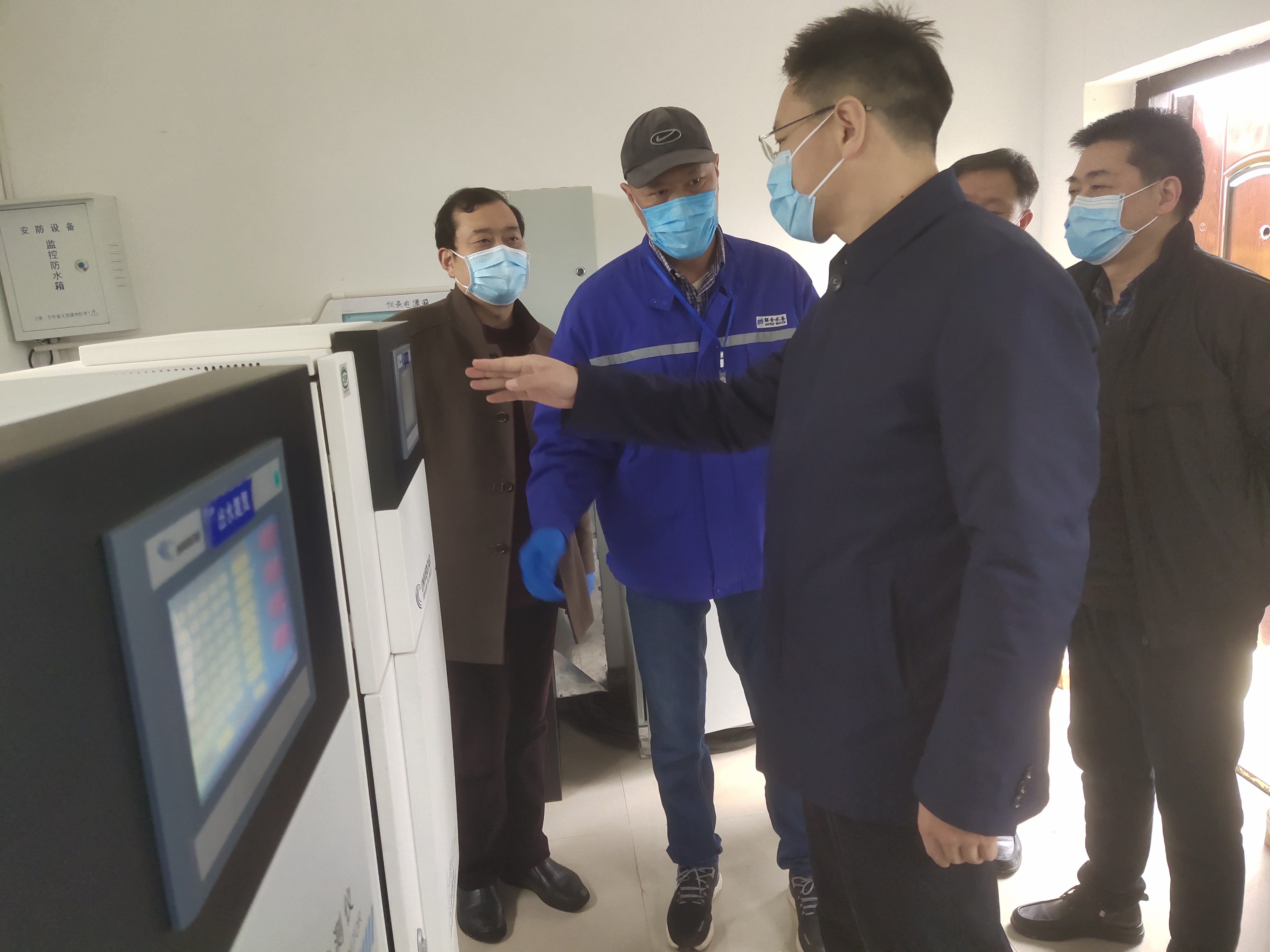 圖2:領(lǐng)導(dǎo)一行在在線監(jiān)測房 公司副總姚行兵、廠長馮超廣針對上述問題現(xiàn)場向克克市長一一作出匯報: 1、在疫情期間,隨州市住建局排水管理處、市生態(tài)環(huán)境局監(jiān)察支隊多次到污水處理廠現(xiàn)場督導(dǎo)檢查、指導(dǎo)工作,聯(lián)合水務(wù)集團高度重視,污水處理廠制定了疫情期間運行管理規(guī)定。 2、疫情前期,聯(lián)合水務(wù)集團協(xié)助從上海、浙江等地采購了部分口罩等急缺防疫物資。工作時段全員必須佩戴口罩、護目鏡等防護用品,每天早晚兩次按時測量體溫,辦公區(qū)、餐廳、工作區(qū)定期消毒。 3、聯(lián)合水務(wù)集團不僅做污水處理,還做供水及黑臭水體、河道治理,目前在湖北省有隨州市污水處理廠、咸寧聯(lián)合水務(wù)有限公司,還有新接手的荊州工業(yè)污水和生活污水一體化項目,并且在江蘇、浙江、江西、河南、山西、內(nèi)蒙等地建有自來水公司和污水處理項目。 4、隨州市污水處理廠(包括污泥脫水車間)共有員工38人,為減少人員外出風(fēng)險,目前有9人24小時長期在崗值班,包括運行、機電、化驗、污泥脫水等在崗員工。 5、污水處理廠目前日均處理污水9萬噸左右,疫情期間采用二氧化氯+次氯酸鈉進行強化消毒,出水水質(zhì)優(yōu)于城鎮(zhèn)污水處理廠污染物排放標(biāo)準(zhǔn)GB18918-2002的一級A標(biāo)準(zhǔn),多項指標(biāo)達到地表Ⅲ類水體。從2019年7月開始,市高新區(qū)的園林綠化及道路灑水都是用的污水處理廠的中水。 最后克克市長對隨州聯(lián)合玉龍水務(wù)有限公司的防疫工作及生產(chǎn)運行充分肯定,要求公司一定要抓好疫情防控工作,確保出水達標(biāo)排放。