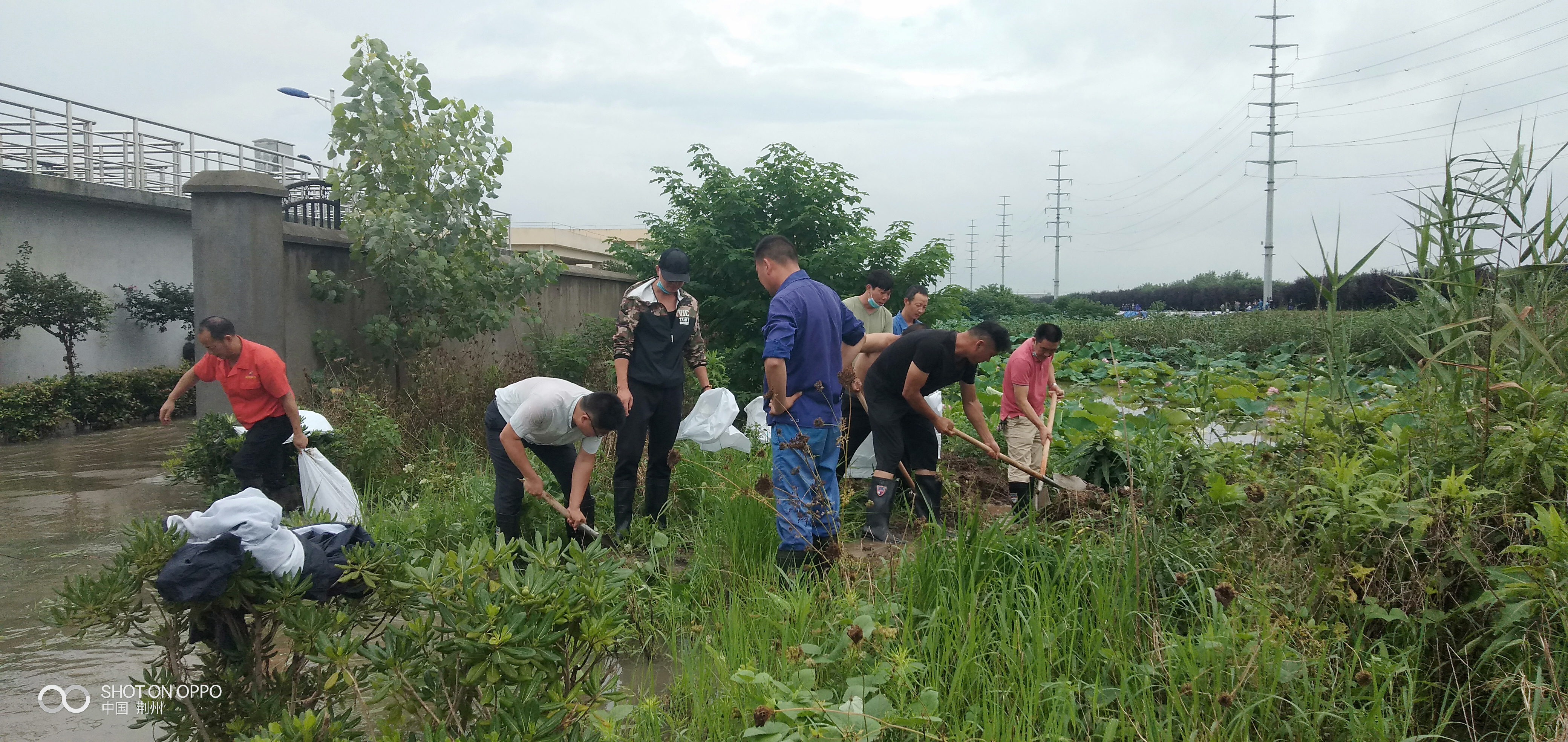 為盡快排空站內積水,搶險隊多措并舉。一隊人員在提排站大門前開挖緊急排水溝,另一隊人員在提排站后門整理泄水坡面,疏通水流路徑,將湖水引流至附近魚塘。盡管雨水無情地傾瀉在身上,汗水濕透了衣裳,泥水浸泡了褲管,但搶險隊員們毫不在意,仍專心致志地進行搶險工作。經過5小時的奮戰,提排站內的積水才逐漸退盡。為了保障提排站后續安全穩定生產,搶險隊又一鼓作氣,在提排站大門口用沙袋搭建起防洪堤,并于下午3點,恢復了提排站的正常運行。