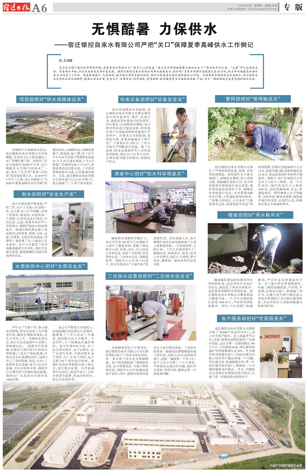 最近是不是習(xí)慣了倚窗聽(tīng)雨,享受清涼世界的日子?很多人心里竊喜:“莫不是今年的酷暑君云游四方去了?”熟不知三伏天已悄然來(lái)臨, “大暑”節(jié)氣也已登上夏日舞臺(tái)。燒烤模式正式拉開(kāi)帷幕。古詩(shī)云,“赤日滿(mǎn)天地,火云成山岳。草木盡焦卷,川澤皆竭涸。入伏之后的熱是不分古今的。一輪輪降雨,天氣潮濕又悶熱,盡管雨水豐裕,但自來(lái)水的需求也絲毫未減。據(jù)宿遷銀控自來(lái)水有限公司供水?dāng)?shù)據(jù)顯示,7月份日均供水量最高已達(dá)28萬(wàn)噸,較去年同期最高日供水量26萬(wàn)噸,有10%左右的增長(zhǎng)。未來(lái)隨著降雨減少,氣溫回升,按當(dāng)前水量需求情況,預(yù)計(jì)今年最高日供水量將逼近33萬(wàn)噸。為保障夏季高峰安全優(yōu)質(zhì)供水,宿遷銀控自來(lái)水有限公司未雨綢繆,提前從生產(chǎn)安全、水質(zhì)安全、科學(xué)調(diào)度、管網(wǎng)保障、提升服務(wù)、項(xiàng)目擴(kuò)建等多方面做足準(zhǔn)備,無(wú)懼酷暑,默默堅(jiān)守,擔(dān)負(fù)使命,嚴(yán)把關(guān)口,堅(jiān)決保證圓滿(mǎn)完成夏季高峰供水任務(wù)。 項(xiàng)目部把好“供水規(guī)模建設(shè)”關(guān) 為確保今年的高峰供水安全,宿遷銀控自來(lái)水有限公司未雨綢繆,斥資約2億元投資建設(shè)二水廠四期擴(kuò)建工程。該項(xiàng)目廠區(qū)總占地面積26244平方米,設(shè)計(jì)規(guī)模為15萬(wàn)噸/天的凈水廠一座,凈水工藝采用“臭氧+活性炭”的深度處理方式。自2019年9月開(kāi)工以來(lái),公司就樹(shù)立“為2020年夏季高峰供水作貢獻(xiàn)”的建設(shè)目標(biāo),在確保安全、質(zhì)量的前提下,抓進(jìn)度、搶工期,終于在2020年4月30日實(shí)現(xiàn)了四期清水池進(jìn)水,5月30日通水調(diào)試,7月6日常規(guī)工藝調(diào)試完成,7月15日,深度處理系統(tǒng)安裝完成, 7月底各項(xiàng)調(diào)試基本完成,已具備通水能力。至此,宿遷銀控供水能力已達(dá)43萬(wàn)噸/天,充分保障了廣大用戶(hù)用水需求。
