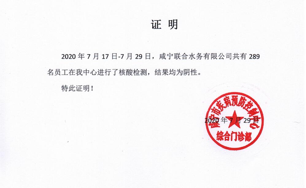 圖2:咸寧聯(lián)合水務(wù)員工檢測結(jié)果均為陰性 疫情期間,咸寧聯(lián)合水務(wù)全員參與,凝心聚力。124名供水員工堅守安全生產(chǎn)供水一線,確保城區(qū)每日近16萬噸供水安全;33名青年員工參與市住建局組織的志愿者活動,奔赴城區(qū)21個物業(yè)小區(qū),協(xié)助小區(qū)物業(yè)開展疫情防控工作;17名黨員干部主動下沉小區(qū)一線,將“堡壘”筑在疫情防控最前沿…… 千淘萬漉雖辛苦,吹盡狂沙始到金。經(jīng)過全體職工的齊心協(xié)力,咸寧聯(lián)合水務(wù)受到主管部門市住建局的贊揚與肯定,并收到其《感謝信》一封,中國共產(chǎn)黨咸寧市委員會、咸寧市人民政府為33名志愿者頒發(fā)“抗疫貢獻榮譽證書”,參與防疫值守的小區(qū)中共14個小區(qū)在《關(guān)于在新冠肺炎疫情防控期間對物業(yè)企業(yè)實行“紅黑榜”管理的通知》中獲得通報表揚,榮登“紅榜”…… 聯(lián)合水務(wù)多年來堅持“以人為本,服務(wù)至上”,始終將職工生命安全和身體健康放在首位,保證全體職工在關(guān)鍵時刻站得出來,在危急關(guān)頭頂?shù)米。卫问刈“踩a(chǎn)底線,為確保城市供水安全保駕護航。 |