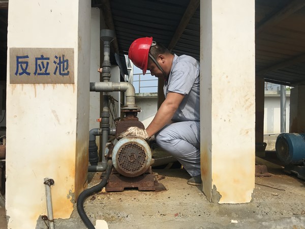 圖2:機(jī)電人員在檢修設(shè)備 用雙腳丈量熾熱的土地,確保生產(chǎn)安全 生產(chǎn)部水區(qū)運(yùn)行工24小時(shí)不間斷對廠內(nèi)各個(gè)工藝段污水指標(biāo)、設(shè)備進(jìn)行巡查。烈日炎炎,他們用雙腳丈量每一寸熾熱的土地,他們的身影不停穿梭在集水池、初沉池、水解酸化池、好氧池、二沉池、終沉池、芬頓池之間。盡管豆大的汗珠在臉上肆無忌憚的橫流,他們依堅(jiān)守在一線,一遍遍巡查,一旦發(fā)現(xiàn)問題,立即上報(bào)。 嚴(yán)控工藝,根據(jù)污水指標(biāo),嚴(yán)格進(jìn)行生產(chǎn)調(diào)控。根據(jù)進(jìn)水情況,調(diào)整前物化段加藥量;根據(jù)溶解氧量,調(diào)整鼓風(fēng)機(jī)出風(fēng)量;根據(jù)終沉池出水水質(zhì),調(diào)整芬頓加藥量。正是因?yàn)閲?yán)謹(jǐn)?shù)墓ぷ髯黠L(fēng)及對工藝的嚴(yán)格調(diào)控,才保證了荊州項(xiàng)目公司出水始終達(dá)標(biāo)排放。