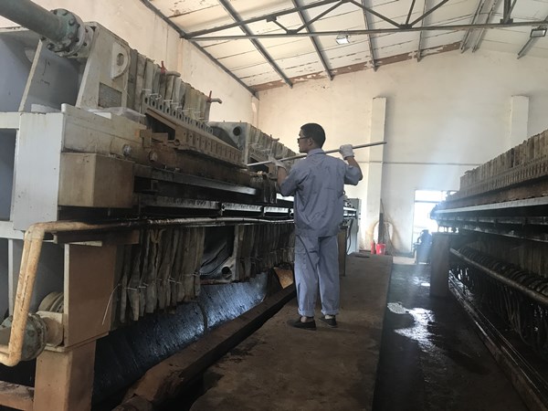 圖3:生產(chǎn)部水區(qū)運(yùn)行工正在巡查設(shè)備 赤膊上陣, “桑拿房”竭盡全力壓泥卸料 荊州項(xiàng)目公司是工業(yè)廢水綜合污水處理廠,因工業(yè)廢水水質(zhì)雜,以致進(jìn)入污水處理系統(tǒng)后產(chǎn)生的污泥成分復(fù)雜,污泥量大。系統(tǒng)產(chǎn)生的污泥經(jīng)過調(diào)理罐加藥調(diào)理絮凝、低高壓螺桿泵進(jìn)料、板框壓濾機(jī)壓榨、卸料這一系列程序后才能拖運(yùn)至污泥焚燒單位進(jìn)行后續(xù)處置。為了保證后續(xù)工作正常開展,泥區(qū)運(yùn)行工需做到當(dāng)日泥當(dāng)日清。 污泥脫水間在太陽炙烤下儼然就是溫度高達(dá)40℃的“桑拿房”,泥區(qū)運(yùn)行工需要在充滿窒息氣味的“桑拿房”內(nèi)竭盡全力壓泥卸料,由于工作服被汗水濕透,貼于身體施展不開,不得不赤膊上陣。面對這嚴(yán)酷的“烤”驗(yàn),他們無懼無畏、奮勇向前、迎難而上。