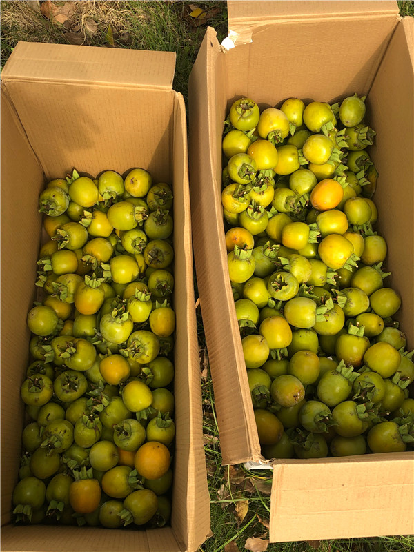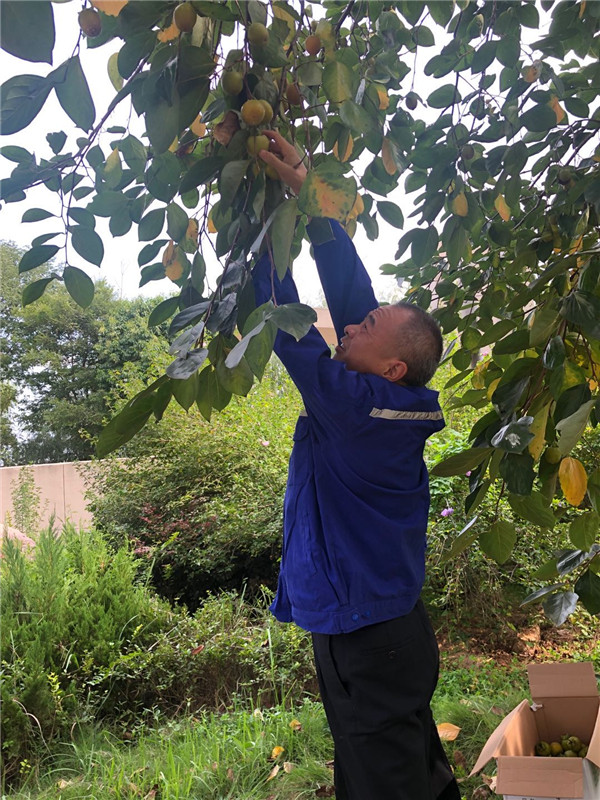 在鄭總的一聲令下,今年的“摘柿節(jié)”正式拉開序幕。也許是中午加餐了的原因,大家都是干勁十足。一開始都是踮起腳尖圍著被柿子壓彎的樹枝摘,很快踮起腳尖能夠得著的柿子都被摘干凈了,但馬上就有人找來了兩張椅子墊著摘。一個(gè)人摘,一個(gè)人抱著紙箱接著,生怕碰壞了一丁點(diǎn)兒,配合得極其融洽。沒過一會兒,墊著的椅子也不夠高了,這個(gè)時(shí)候就需要一兩名“勇士”了。張廠長和童哥自靠奮勇爬到樹上,瘋狂地收割著今年的“成果”。樹下的人也沒閑著,舉起長長的網(wǎng)兜接著剛摘下來圓鼓鼓的柿子。采摘進(jìn)行得非常順利,陽光下,大家一個(gè)個(gè)都笑得合不攏嘴。有人上樹,就有人接著柿子,有人爬梯子就有人扶,有柿子掉地上,立馬就有人去撿。一個(gè)多小時(shí)的時(shí)間,竟然摘了整整五大箱。柿子樹下一片祥和的畫面,不身在其中很難體會到這種美好!