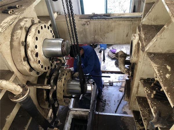 桐鄉(xiāng)申和水務(wù)有限公司非常注重安全生產(chǎn),巡檢人員兢兢業(yè)業(yè),認(rèn)真做好每一次巡查工作。在近日一次日常巡檢中,機(jī)電設(shè)備部人員發(fā)現(xiàn)板框壓濾機(jī)有漏油現(xiàn)象,經(jīng)緊急排查發(fā)現(xiàn)下部活塞處漏油。在聯(lián)系廠家技術(shù)人員確定是活塞處油封問題后,為了確保設(shè)備運行正常,機(jī)電部人員立即展開了維修工作。在克服重重困難下,對板框壓濾機(jī)的活塞油封進(jìn)行了更換,同時考慮到壓濾機(jī)過于龐大,拆卸困難,便將上部活塞的油封一并進(jìn)行了更換。