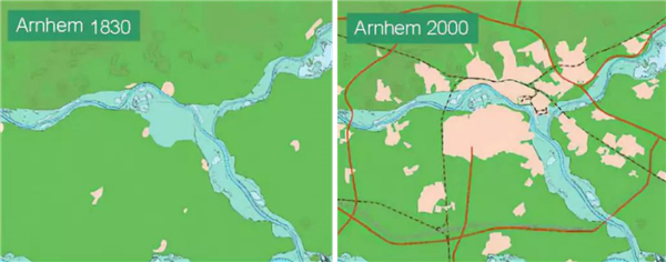 備注:圖片來源于網(wǎng)絡(luò) 奈梅亨(Nijmegen)退堤工程位置位于瓦爾河(Waal River),是河流從德國至荷蘭境內(nèi)后的關(guān)鍵節(jié)點,敏感性極高,城市發(fā)展不斷擠壓河道生存空間,加劇了洪水與城市之間的緊張關(guān)系。