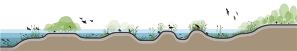 備注:水生植物對氮和有機質(zhì)的去除機制 魚蝦螺貝等水生動物也是修復過程中必不可少的一環(huán)。其凈化機理分為直接和間接兩種:一、水生動物通過攝食水體中有機懸浮物、藻類及植物腐敗殘體等方式,直接削減水體中富營養(yǎng)物質(zhì);二、水生動物通過攝食或其分泌物的天然絮凝作用,提高水體透明度,增強沉水植物光合作用,間接促進植物對水體的凈化效果。 棲息地營造與恢復也是水生態(tài)修復的重要目的。通過微地形營造及草-灌木-喬木小生境的設(shè)計,可有效實現(xiàn)生物多樣性的恢復及棲息地的打造。如涉禽類主要于水深10-23 cm的空間內(nèi)活動攝食,而游禽類主要于水深50-200 cm范圍內(nèi)游憩活動,水深30 cm范圍內(nèi)覓食,而不同的植被可為其提供產(chǎn)卵、棲息的隱蔽空間。