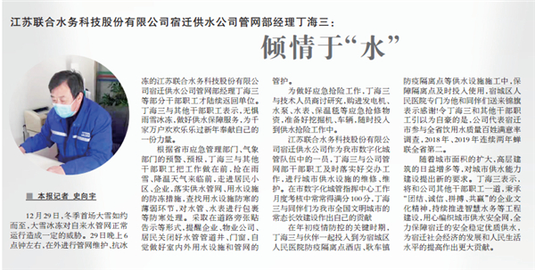 恰逢陽(yáng)歷新年前夕,大戰(zhàn)寒潮之時(shí),宿遷供水公司管網(wǎng)部經(jīng)理丁海三被《宿遷日?qǐng)?bào)》專(zhuān)版約訪(fǎng)并報(bào)道,這是一份屬于聯(lián)合水務(wù)供水人的榮耀。