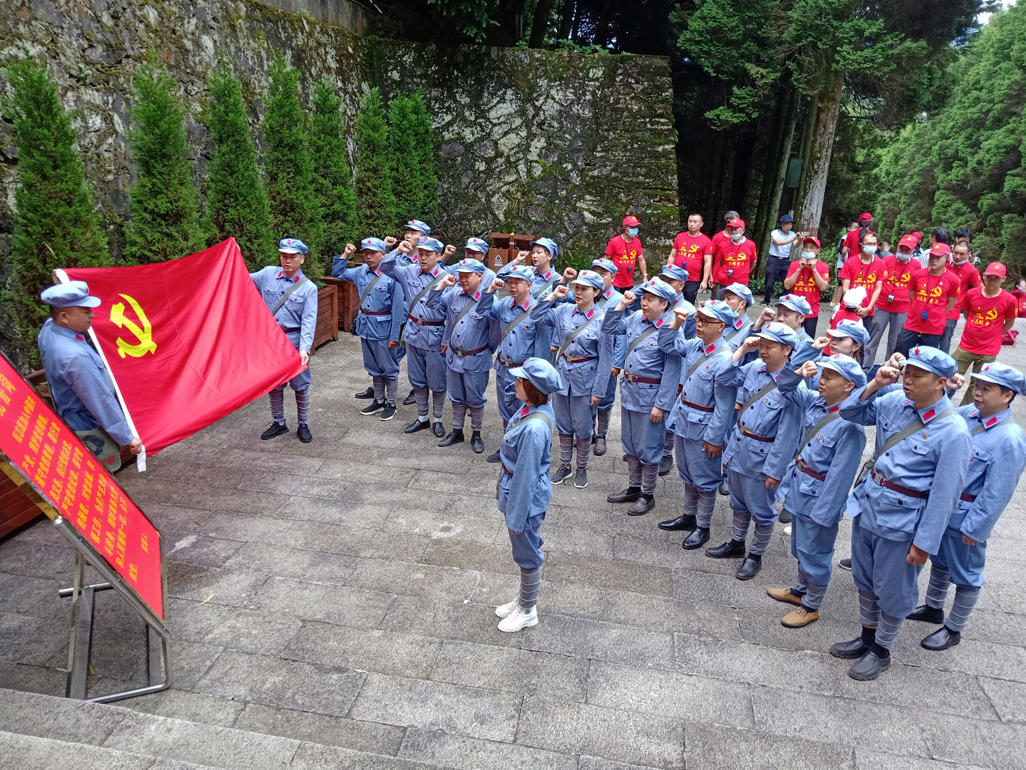 重溫黨的誓詞 在海拔1343米巍峨峻拔、地勢險要的黃洋界哨口,著名的黃洋界保衛戰就發生在這里,毛大家身臨其境,在講解員的解說中,依稀聽到當年隆隆炮聲,更進一步認知到革命先烈堅定的理想信念、勇于犧牲的崇高品質。 在井岡山革命烈士陵園,黨員同志們懷著無比崇敬的心情,走在這片被革命先烈用鮮血和生命染紅的土地上,向革命先烈們敬獻花圈,并再一次莊嚴地舉起右手,面對黨旗,重溫入黨誓詞,領悟了一種精神──井岡山精神,這種精神不但是革命勝利的根源,同樣也是實行改革開放、現代化建設取得成功的一個根源。