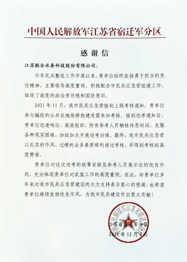 近日,江蘇省宿遷軍分區開展民兵年度考核驗收工作,經過一天的考核,江蘇聯合水務科技股份有限公司最終以扎實的作風、過硬的業務素質順利通過省、市兩級驗收和考核。考核結束后,宿遷軍分區向公司發來感謝信,感謝聯合水務多年來對宿遷市民兵應急營建設的大力支持。