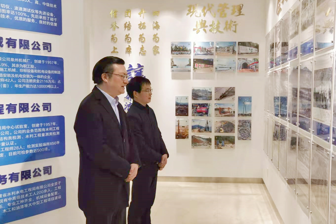 會前,劉總一行在福建省水利水電工程局有限公司總經(jīng)理助理楊世杰及經(jīng)營部經(jīng)理馬碧山的陪同下,參觀了福建水利建設(shè)成就展覽館,馬經(jīng)理向劉總詳細介紹了福建水利一路走來的發(fā)展歷程以及取得的相關(guān)成就,劉總對合作單位取得的成就由衷祝賀,并表示對今后聯(lián)合水務(wù)和福建水利強強聯(lián)合充滿期待。